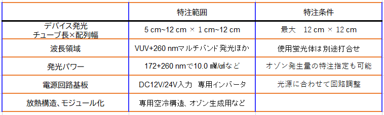 発光チューブ長とさおの配列構成により、発光エリアと縦横比率を設計でき、真空紫外(147/172nm)励起型の蛍光体を用いて様々な発光波長を実現可能。異なる発光体の発光チューブを複合配列することも可能。