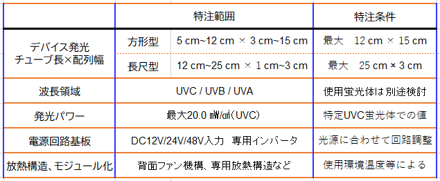 省電力型~高出力型の特注に対応。8x6 ㎠サイズ260nmでは1,000㎽(20 ㎽/㎠)が可能。